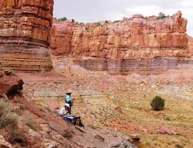 (Left) Studying the Lower Jurassic Whitmore Point Member of the Moenave Formation in the Vermillion Cliffs in the Arizona-Utah border. (Right) At the classic K/T boundary section near Gubbio, Italy