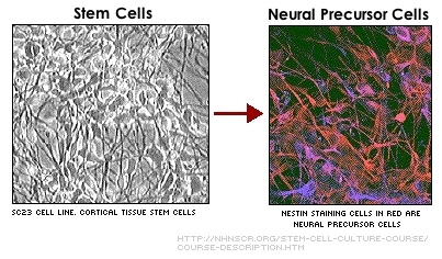 - Pluripotent stem cells (** see below) divide & redivide and become neural precursor cells (NPC). Some NPCs become primitive neurons & some become glial cells (see images on right) as they migrate to other locations. Some stem cells remain in place and continue to divide.
